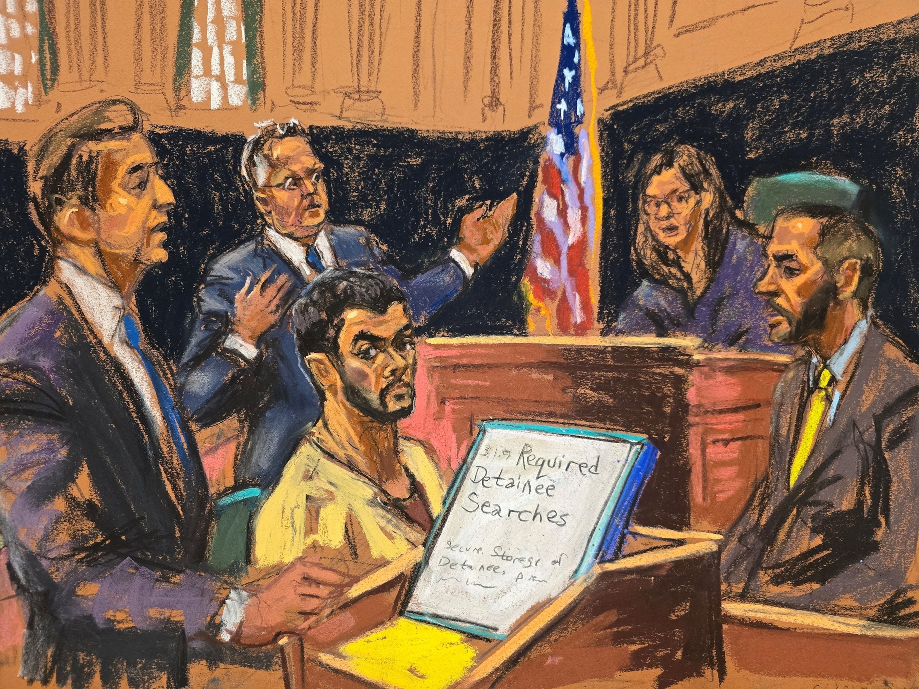 Altoona Police Department Deputy Chief Nathan Snyder is questioned by Dominic Gentile as Marc Agnifilo and Luigi Mangione listen and Judge Margaret Garnett presides at the Manhattan Federal Courthouse in New York City, January 23, 2026.